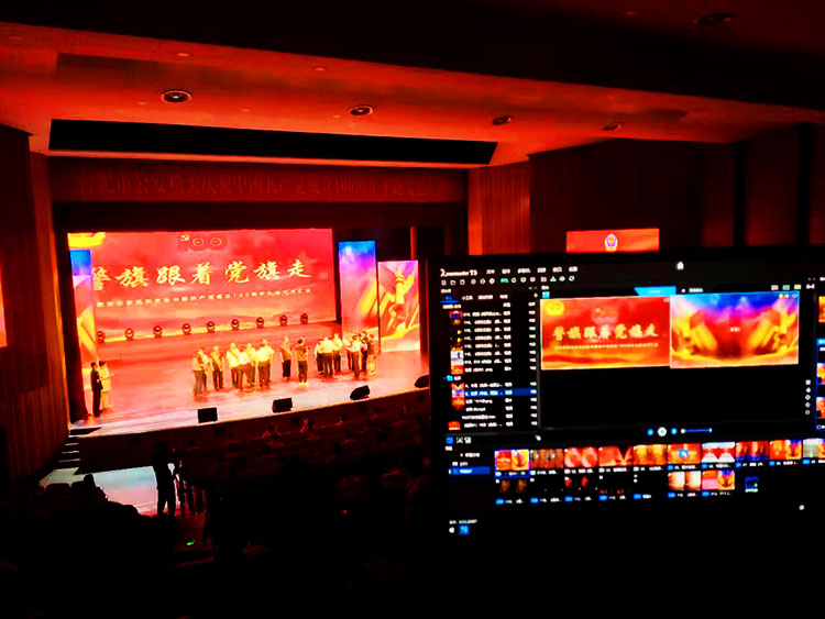 6月22日晚,合肥市公安局在市工人文化宫举行庆祝中国共产党成立100周年主题文艺活动。此次主题文艺活动使用一台幻影服务器控制现场屏幕,并使用Kommander T3 软件完成前期光路设计与效果预演,保证了现场舞台效果。