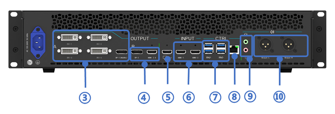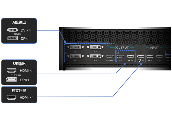 8通道输出A组单路DVI最大支持1920*1200@60Hz, 可单独输出完整画面, 拼接后的画面与DP-1互为复制; B组DP-2与HDMI 2.0最大均为3840*2400@60Hz输出, 两者互为复制;一路2K-HDMI独立回显。