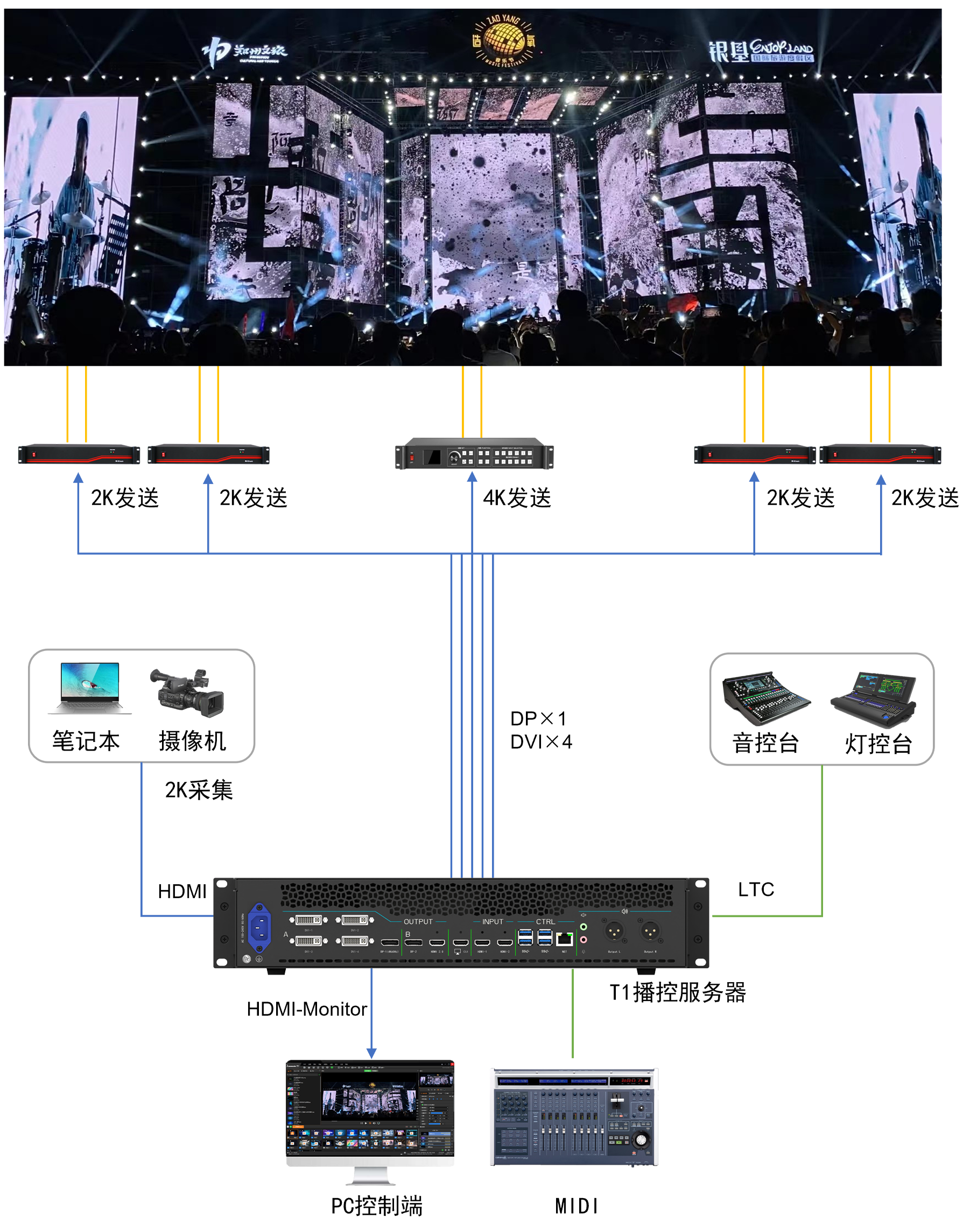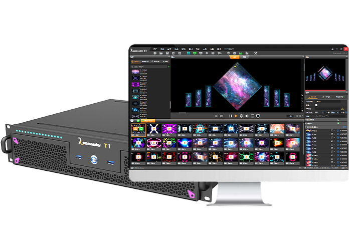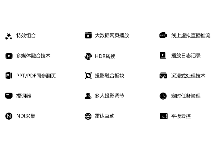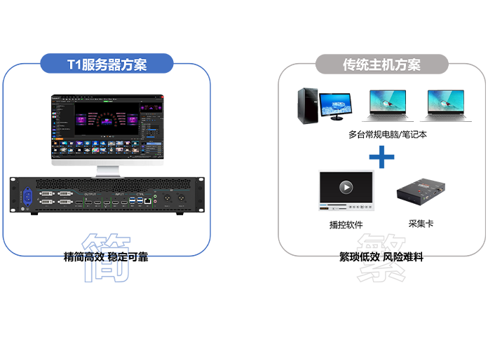 以简替繁集多通道拼接输出、多路采集输入和多媒体播控于一体 取代舞台演出活动中的多台电脑/笔记本、采集卡和播控软件, 解决多台电脑播控管理混乱、输出口数量受限、 无信号输入口、长时间工作频发异常等问题。