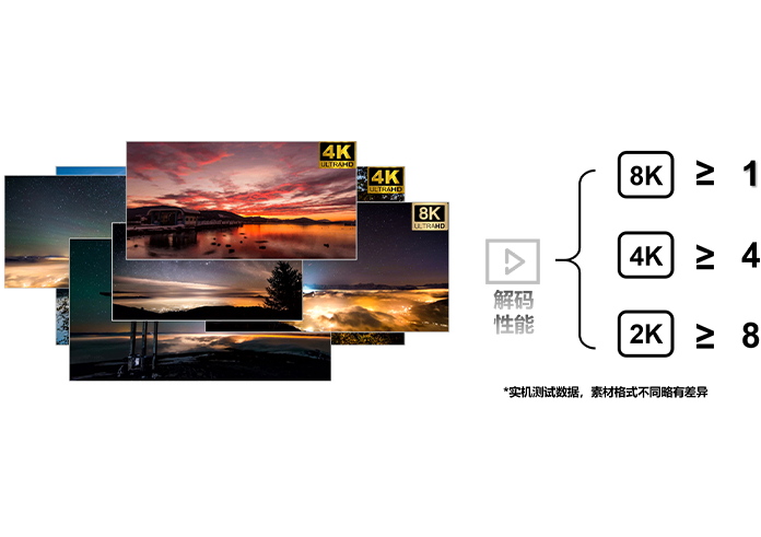 8K硬解性能相当于i7 CPU+P2200专业卡,支持8K素材硬解, 高清视频播放不卡顿/撕裂。 支持同时播放至少4个4K或8个2K画面, 取代传统多电脑方案,避免出现管理混乱。