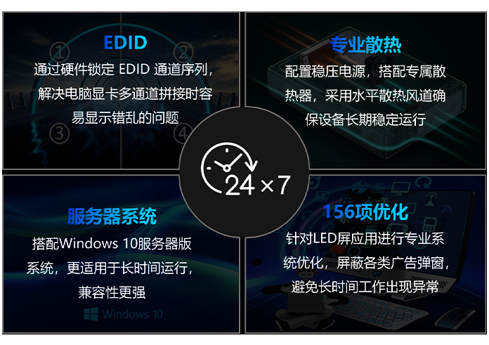 156项优化硬件锁定EDID、专业电源及散热配置、 Win10服务器版系统及156项专业系统优化屏蔽各类广告弹窗, 兼容性更强,确保设备7×24小时稳定运行。